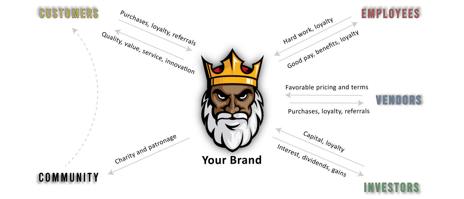 For us, brand is The Benevolent King, a construct of an ideal company. As with the king, the function of a brand is to benefit the people who serve it, including customers, employees, and investors. A brand benefits or rewards people via exchanges, like selling quality products & services (for money), paying generous wages & salaries (for work), and returning profitable dividends or gains (on investment). To achieve success and growth, a brand must excel in maximizing rewards for all who serve it.